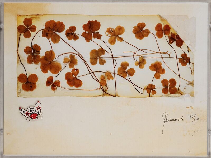 impression offset sur Chromolux, collée sur du papier Steinbach et parachevée avec un vernis brillant. Rehaussé par l'artiste d'un petit hanneton en offset imprimé sur du papier Steinbach. Encadré dans une boîte en plexiglas.