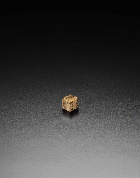 Ce dé romain cubique possède le système de répartition des points 1 opposé à 6, 2 opposé à 5 et 3 opposé à 4. La somme des points opposés donne toujours le chiffre 7. Une telle répartition des points était la norme à l'époque romaine, peut-être sous l'influence du système grec de répartition des points sur l'osselet.